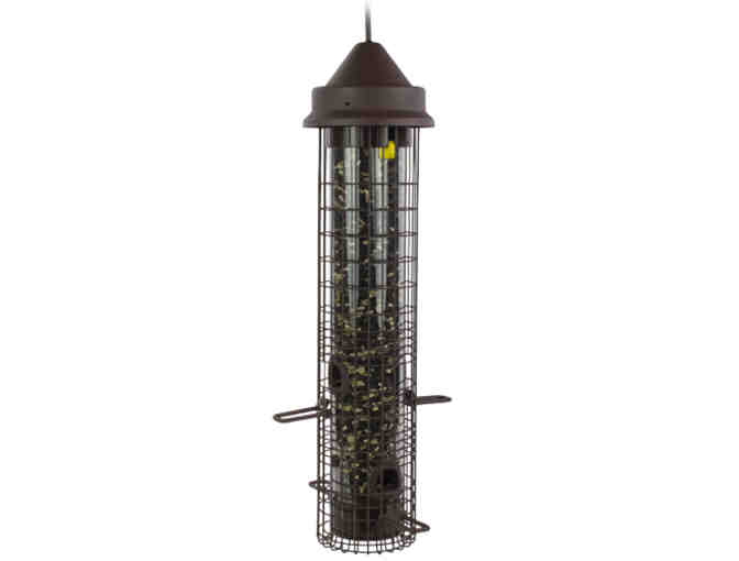 So long squirrels! This Fundamentals Squirrel-Proof Birdfeeder is weight-sensitive, so when a squirrel gets on the feeder the feeding ports close, denying access to the seed. Birds can use the four perches, or they can cling to the metal shroud to feed.