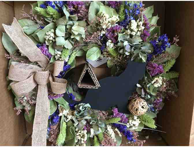 This gorgeous wreath is assembled by hand with a variety of peserved and dried natural leaves with flowers, and is finished with a black cat to greet visitors.