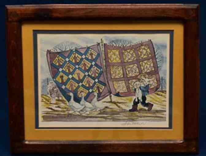 Jean Berlyn's original painting is Amish-themed and includes quilts. She is originally from Brownsburg, Ind.