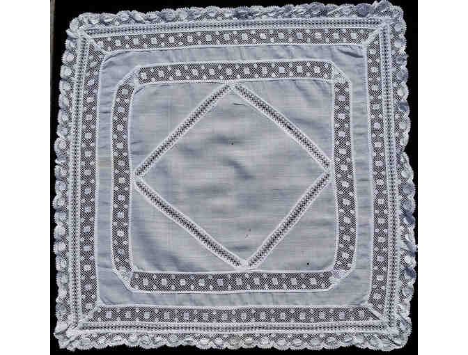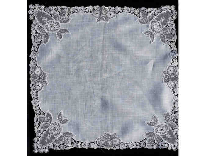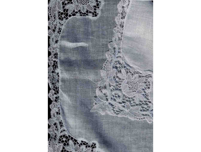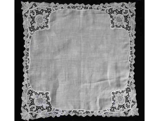 Three linen and lace handkerchiefs, circa 1920's - 1930's. This type is known as a "Wedding Handkerchief." The first one is tape lace; the second is net lace (embroidery upon mesh or net); and the third is needle lace. They were made in Belgium.