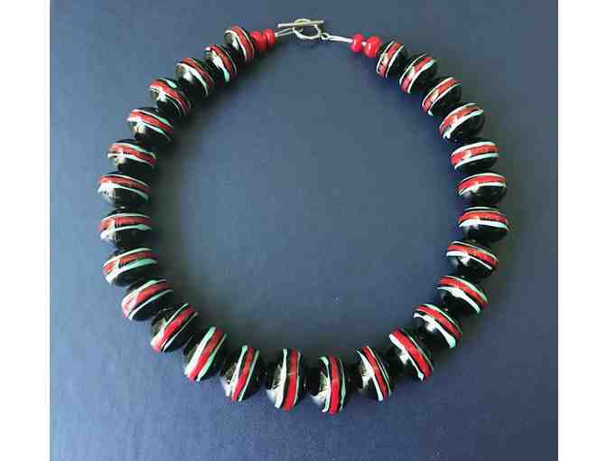 Karolina Kopriivov, Berry black, and sage beaded necklace, 20 long, Flameworked glass, 2017
