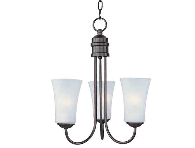 This three-light chandelier in bronze finish with frosted glass measures 17" wide x 19" high.