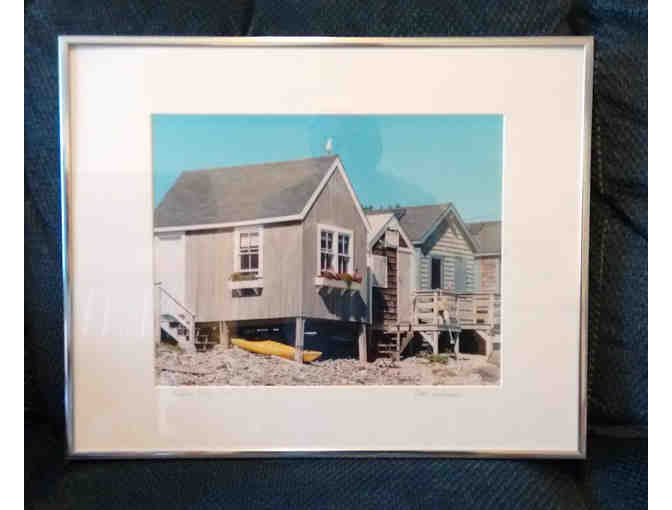 This piece measures 10" x 13" in a 16" x 20" black frame. Expertly matted and framed, this striking piece features homes along the shore.