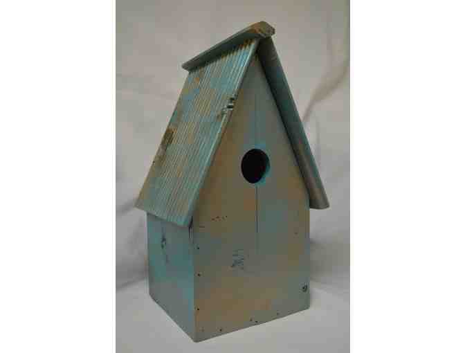 Rust-oleum paint, water and a rag were used to create this unique birdhouse
