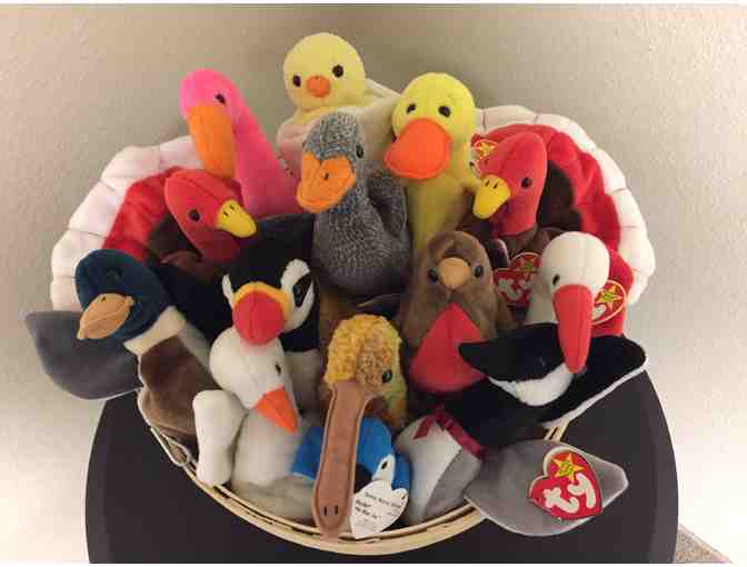 Look how cute this basket is. It is full of Ty Beanie Babies. They are all staring at you saying "take me home with you". Don't let them down. Their names are: Loosy, Quakers, Pinky, Puffer, Stilts, Early, Beak, Gracie, Jake, Honks, Eggbert, Gobbles and baby Rocket.