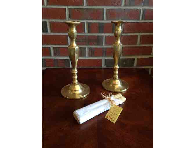 Gently used antique brass candlesticks, 11” high with 5.5” diameter base, with two pure beeswax long-burning handmade rolled candles.