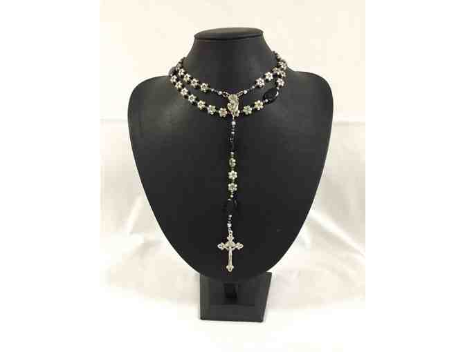 This rosary is handmade, with pewter daisy Ave beads, blue goldstone Pater beads, purple glass pearl separator beads, silver accent beads, Madonna & Child center with Fleur crucifix, in a purple glass container. Blessed by Fr. Todd Nance.