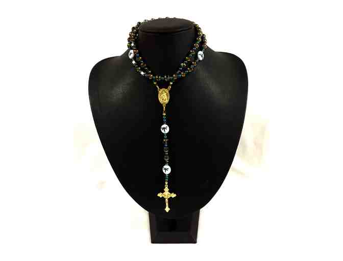 This handmade rosary is made with white ceramic beads with blue dragonflies (Pater beads), and aqua crystal Ave beads. It also features teal glass and aqua crystal separator beads, a gold Virgin of Carmel center, and gold Fleur crucifix. Blessed by Fr. Todd Nance.