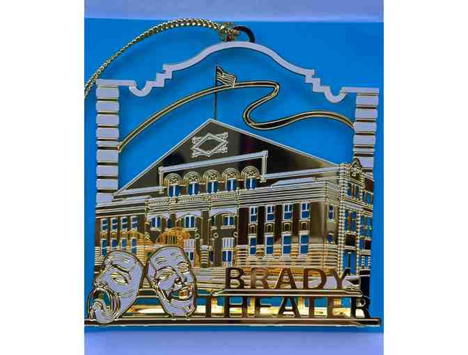 Decorate your Christmas tree with this beautiful view of the historic Brady Theater building as it appeared in 1914, when first built. This ornament is crafted of solid brass with 24K gold wash, measures 2 1/4" square i red leatherette gift box with informational insert.