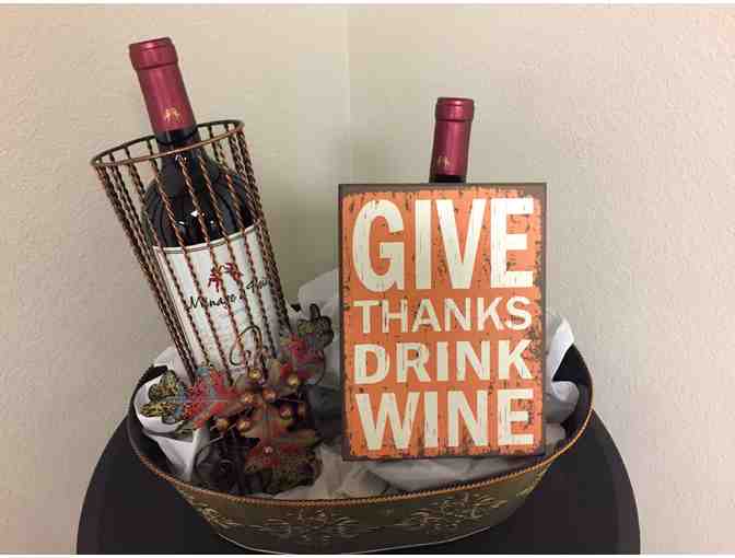 Wine not bid on this? You get 2 bottles of Menage a Trois red wine. Need I say more? Well just in case I do, it also comes with a candle holder and a cute picture that says "Give Thanks Drink Wine". Oh, look how cute the basket is.