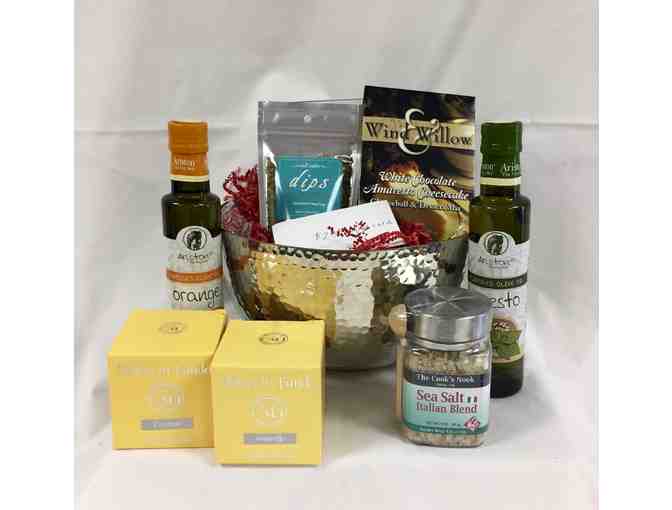 This beautiful copper-coated bowl is filled with an arrwy of goodies from the Cook's Nook! Along with a $25 gift card, you'll get orange-infused olive oil, pesto-infused olive oil, white chocolate amaretto cheesecake mix, candles, dip, and sea salt Italian blend.