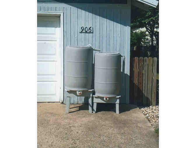 You are bidding on two full-sized rain barrels. They are designed to work together. As one fills it empties into the second barrel for greater storage capacity. They barrels are weather-resistent with a gray finish. They could easily be decorated to fit one's own home color scheme.