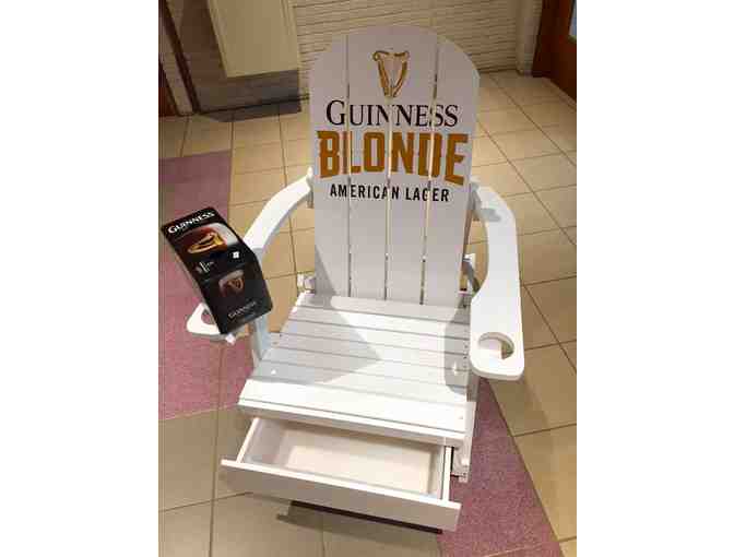 This white adirondack chair is made from high-quality wood and features two cup holders, plus an insulated cooler drawer with drain. When not in use, the chair can be collapsed for easy storage. Customized with the Guinness Blonde beer logo, this garden chair comes complete with a 12-pack of Guinness beer to help you fill the cooler.