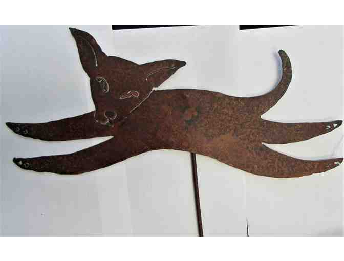 Imagination and creativity and upcycling to boot! This piece was created by a local metal artist from household water tanks. "Run Dog" measures 19" in length by 9" in width, and has a 26" round metal stake in the back for your yard, garden, or lawn.