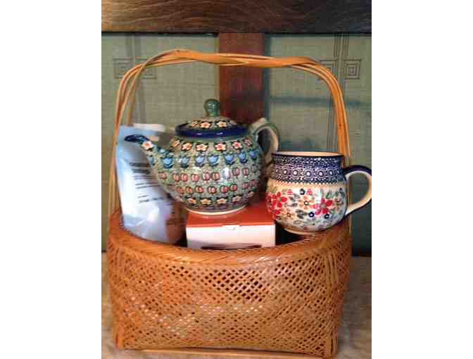 Reverie provides this gorgous basket of tea delights. Included are a Polish pottery teapot, signed tea mug, designer dish towel and three types of tea in a glass storage container.