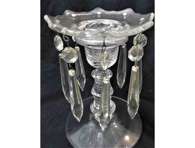 This pair of antique glass candle holders is unique. Each candle holder is surrounded by dangling crystals.