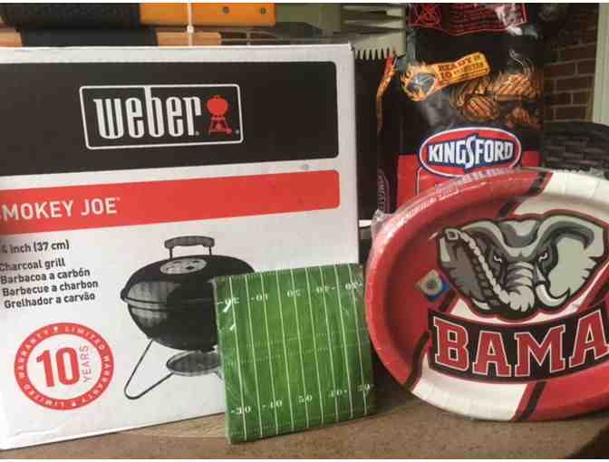 This package includes 1- 14" weber grill, grill tools, bag of charcoal, 50 Alabama plates, and napkins
