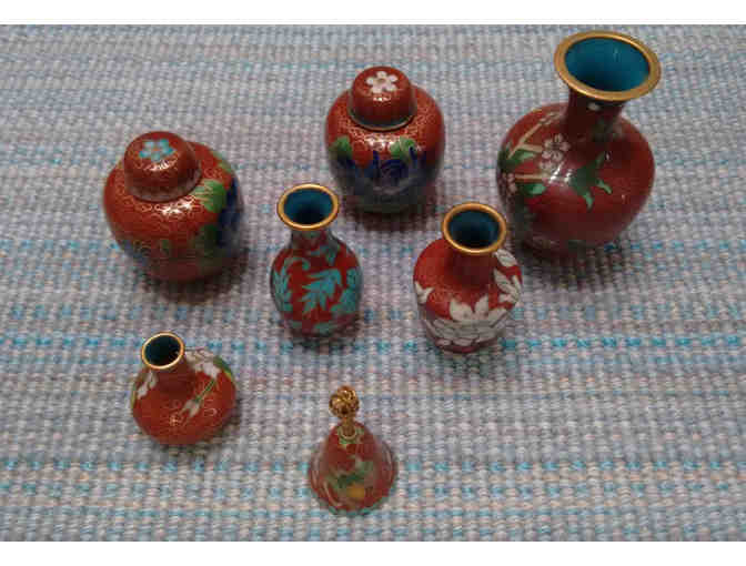 This collection of minature cloisonne pieces is particulary handsome, in that they all fit together in the color scheme. The are small enough to be easily transported, and pretty enough to be place on you curio shelf.