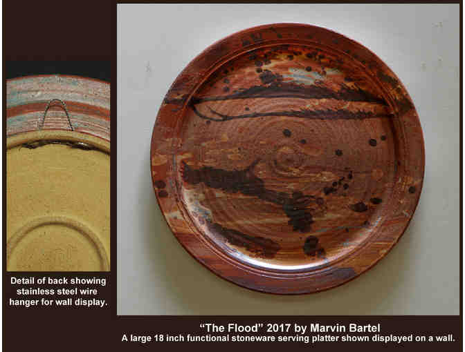 This 18" stoneware platter, titled "The Flood," is suitable for food service or display. Note the wire hanger Marvin Bartel has placed on the back so the platter can be hung on the wall.