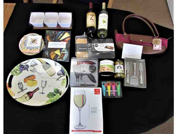If you love wine and cheese and other gourmet goodies, this overflowing gift basket is for you! In addition to a versatile $25 gift certificate, this amazing array of mouth-watering treats, utensils, tray, and indispensable gadgets includes: