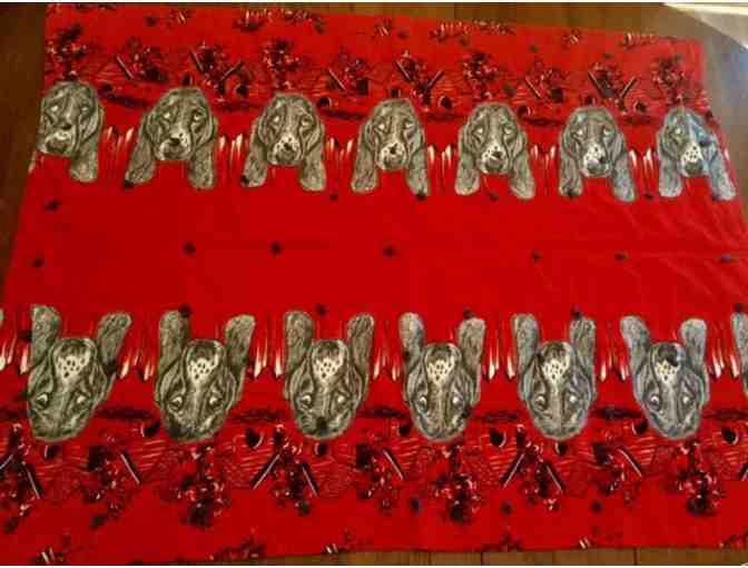 Vibrant colors in red, black, gray/brown and white. Adorable basset hound images with dog houses and a fence! A one of a kind vintage find. Use it as a cozy throw, a royal roost for your hound on the couch, or as a wall hanging. Back side is primarily black flannel with patterned edge. Sweet.