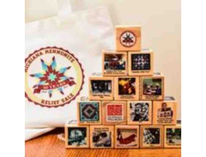 Other info concerning the blocks:  Blocks are made with a “hard coat” non-toxic water resistant finish which can be gently cleaned with a damp cloth.  Each block has at least 4-5 coats, some more. The process used to make the blocks is decoupage, which became popular in the US in the late 1960's and  1970's, during the time the Michiana Mennonite Relief Sale had its beginnings.