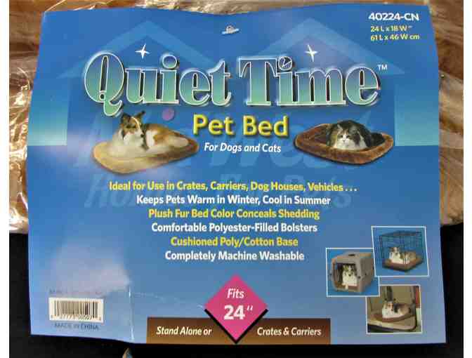 This comfy pet bed may be used for either a dog or a cat. Its dimensions are 14" x 18" wide. It is ideal for use in your home, or in crates, carriers, dog house, or vehicles. It keeps pets warm in winter and cool in summer. Its plush fur bed color conceals shedding and it is completely washable.