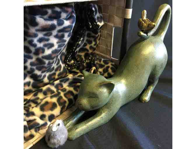 This whimsical statue of a cat and bird will look lovely -- indoors or outdoors! Designed to sit on a flat surface, this statue is made of aluminum, hand-painted and polished. It is specially coated to withstand the sun and rain, so you can use it outside without worry. It is approximately 11" tall, 14" long and 4.5" deep, and is package in a lovely reed basket, with a soft plush throw that your pet cats will love.