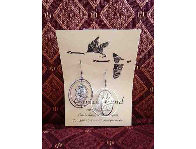3D snowflake earrings from Goose Pond in Cumberland, Maine. Three concentric circles with snowflake center. Silver, imitation rhodium plated, gold filled or solid sterling wires.