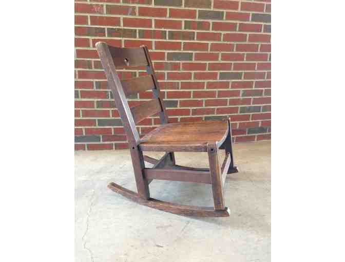 Low-seated, short oak rocking chair with three-slatted ladder back. Stained in dark brown. Gently used.