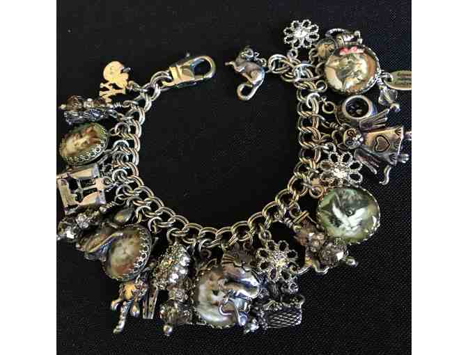 Show everyone your love for cats! Inspired by a love of vintage charm bracelets, Blackberry Designs Jewelry has created a beautiful cat charm bracelet made of stainless steel. Called "Cat's Leave Paw Prings on your Heart, the bracelet contains 5 vintage images from the 1920's, 15 pewter and silver plated charms of cats or cat related items plus 10 Swarovsky Crystals in Topaz gold. !