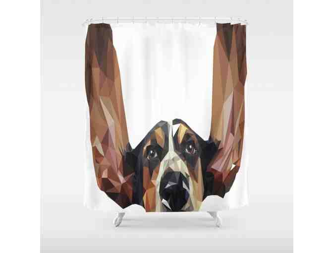 WOW your bathroom decor with this splendid graphic! Designer basset hound shower curtain is made from 100% polyester, printed in the USA and features a 12 button-hole top for simple hanging. The easy care material allows for machine wash and dry maintenance. Dimensions are 71in. by 74in.