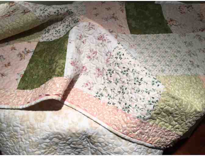 Lap quilt in soft peach and green, all cotton, measuring 48" x 60", pieced by machine and quilted--made with love by Joan Burns.