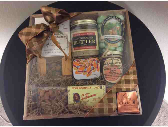 Enjoy this healthy basket of almonds, almond cashew butter, mint chocolate almonds and more.