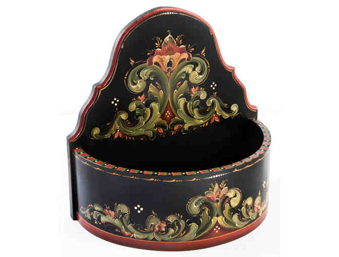 12"H, 7"W. Scalloped, curved back. Woodenware by Mike Lusk. Signed and dated by the artist, 2017. Artist: Andrea Herkert, Vesterheim Gold Medal rosemaler.