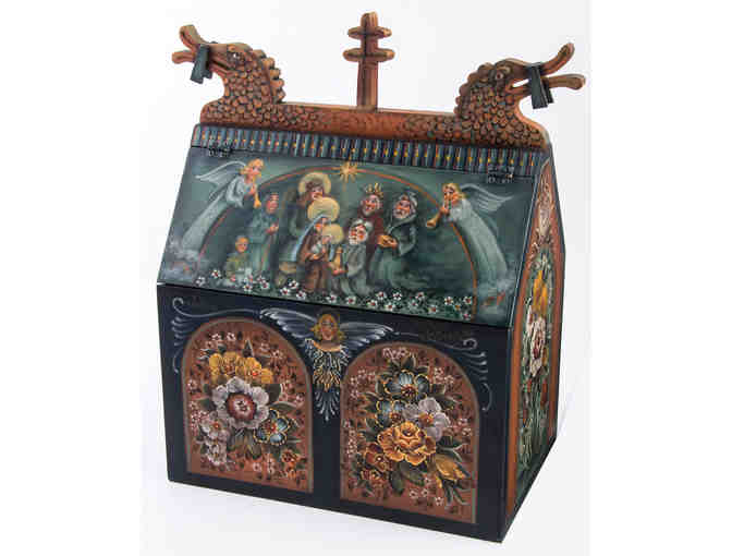 12"L, 8"W, 16"H. The reliquary was probably made in Norway. This piece is modeled on reliquary in Hedalen Stave Church in Valdres. It has dragon heads at the roof peaks and a hinged lid. Signed and dated by the artist. Artist: JoSonja Jansen, Vesterheim Gold Medal rosemaler.