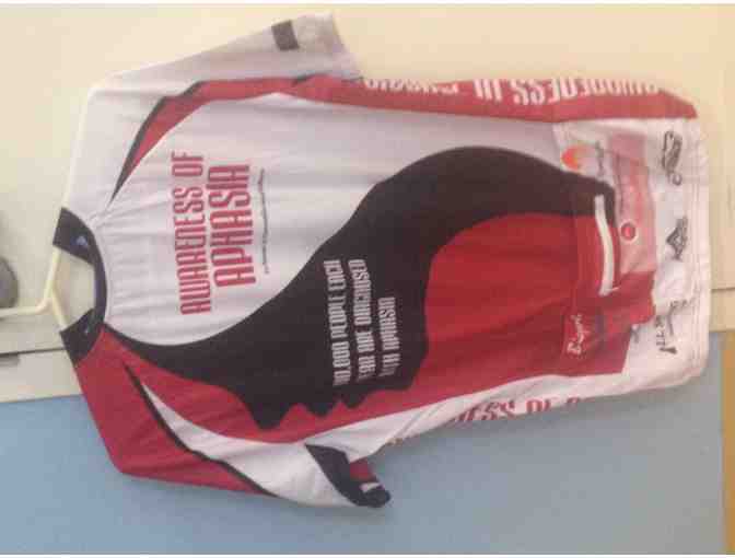 Front reads: "Awareness of Aphasia", "1 in 250 people will be diagnosed with aphasia". Tetra Cool jersey with side ventilation, three rear pockets, size M