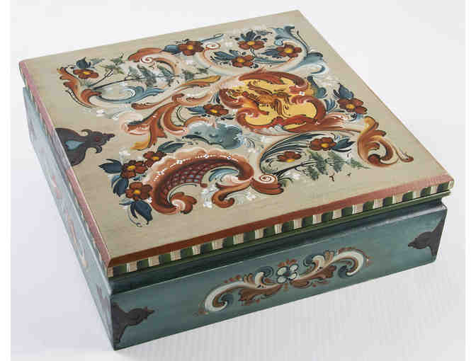 12"L, 12"W, 4"H. Has Gold Leaf Cartouche. Woodenware by Mike Lusk. Design inspired from rococo sled painted by Torres Uv in the Sverresborg Museum in Trondheim. Inside lid inscribed in Norwegian, "I livet lykke, i hjertet fred, i hjemmet hygge og kjærlighet." English translation on bottom, "In life happiness, in heart peaces, in home peace and love." Signed and dated by the artist, 2015. Artist: Pam Rucinski, Vesterheim Gold Medal rosemaler.
