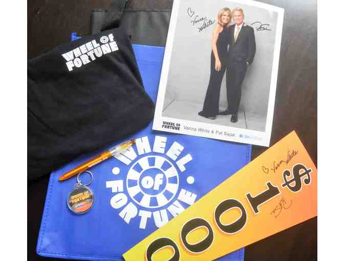 Also enjoy a bag full of fun Wheel of Fortune items including a reusable tote bag, a t-shirt (size adult large), a pen, a keychain, a signed wheel piece and signed photo of Pat Sajak and Vanna White!