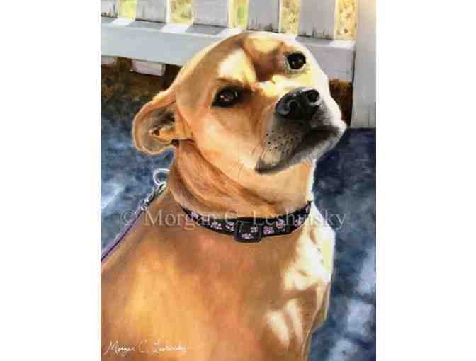 A gift certificate good for one 11" x 14" or 12" x 12" custom pet portrait of a single pet painted by Morgan C. Leshinsky. All portraits are painted with oil on canvas using reference photographs supplied by the patron. Morgan's pet portraits are "painted with much thoughtfulness and sensitivity for pet parents who [wish] to honor their furry friends in a special way."
