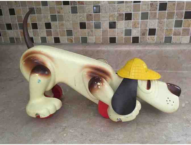 Digger Dective Dog, 1974 Romper Room from Hasbro child's toy.  He;s approx. 14" long, has lost his pull string, his back legs move well but his front legs do not.  Shows signs of wear but would be an adorable piece for a Basset collection!