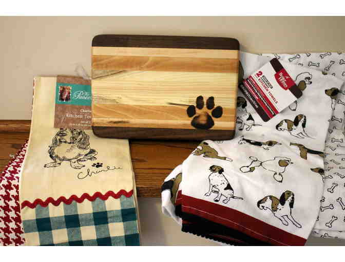 It features a handmade cutting board in Walnut, Hickory and Maple!   The board is hand oiled and waxed and completely food safe.  The paw print is branded into the wood.  Handwash only.  The board is made from repurposed Iowa Hardwoods.