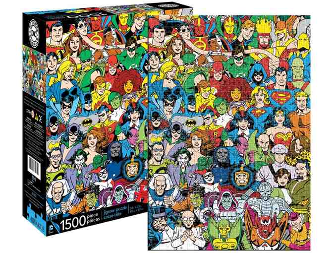 Heroes, villains, and all those in between gather in this colorful 1500 piece puzzle, which measures 33" x 22" when completed. llustrated in the classic style, this puzzle is packed with all your favorite characters from the pages of DC COMICS.