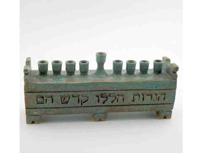 Styled like a bench in an old European synagogue. Matte stone glaze with antiqued patina. Hebrew on front: "Hanerot halalu kodesh hem" (These lights are sacred).