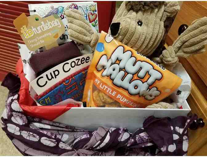 This adorable package includes so much you can't help but feel "Stuffed with Love"! The basket includes a coloring journal, a Turdlebag, a cup cozee, a paw-themed scarf for ladies (tied around the basket), a Hugglehound Hedgehog and a package of Pumpkin/Cinnamon Mutt Mallows.