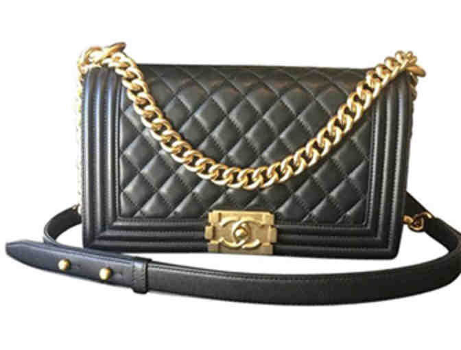 PRIZE INCLUDES: One medium black Chanel Boy Bag, with gold chain; packaged by Chanel and including a card of authenticity.