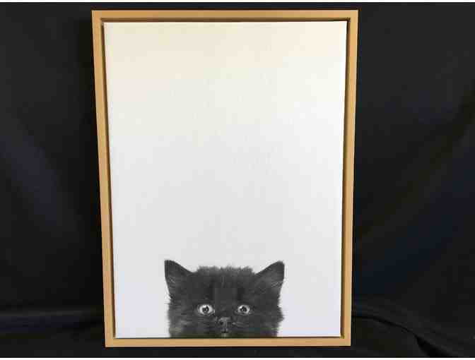 The truly adorable kitten peeking up from the edge of this framed graphic print on wrapped canvas is sure to delight all who see it. It is whimsical, yet striking, and would make a wonderful addition to any art collection.
