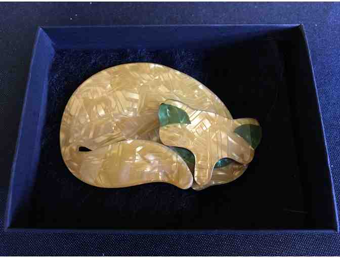 Lea Stein is a French artist and accessories maker. She entered the fashion industry in 1957 working in textiles and then developed an interest in plastic. She worked with her husband to develop a process of layering very thin sheets of cellulose acetate and laminating them to form a "muti-colored sandwich of plastic". Each 'sandwich' is baked for a long time, then cooled and cut into shapes. The process can take as long as six months. The brooch has a distinctive v-shaped metal clasp inscribed with "Lea Stein Paris".