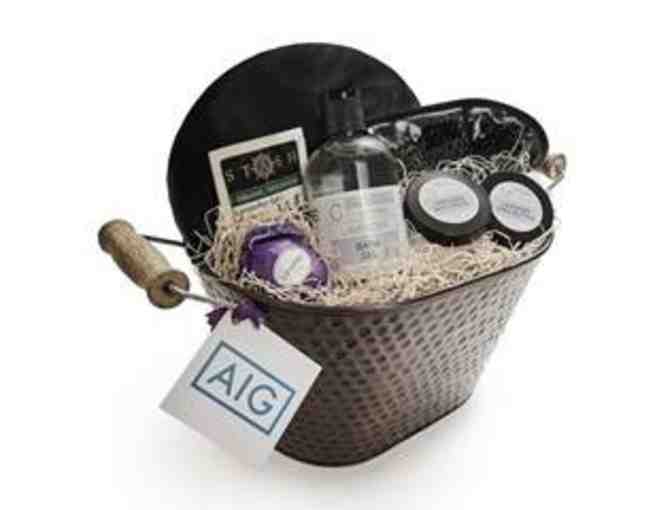 The Luxurious Lavender Spa Set is reminiscent of a beautiful hammered copper bathtub. The 10" tub is filled with our most loved spa products including a plush gel sleep shade and luxurious neck pillow, moisturizing natural lavender bath bomb, nourishing 2 oz lavender shea butter, 8 oz lavender body wash, 2 oz lavender foot soaking salts, and an Organic Lavender Tulsi Stash tea packet. Logo: AIG logo on hangtag.