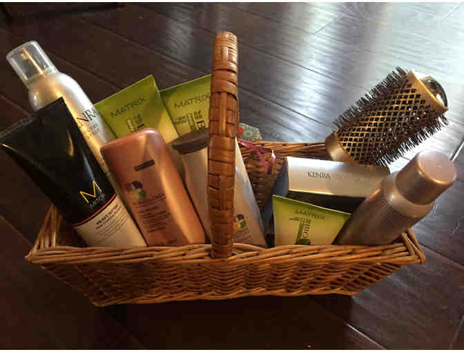 Basket fillied with professional hair care products such as Shampoo and Conditioner by Pureology and Matrix!